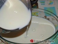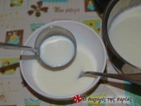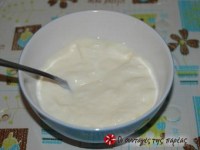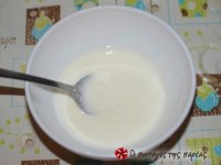 2) Σε ένα μπολάκι βάλτε 2 κουταλιές της σούπας γιούρτι έτοιμο. Βάλτε μερικές σταγόνες κρύο γάλα μέσα και ανακατέψτε το, να γίνει σαν νερουλή κρέμα.