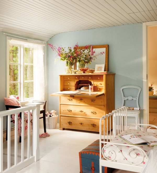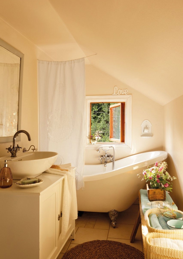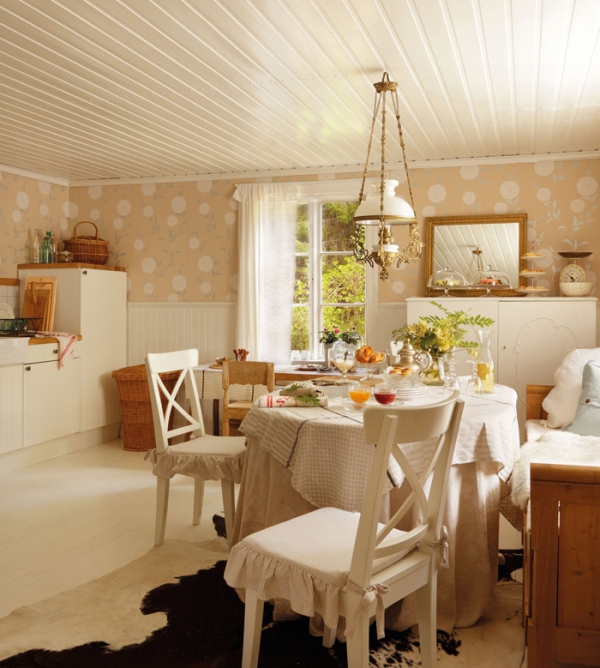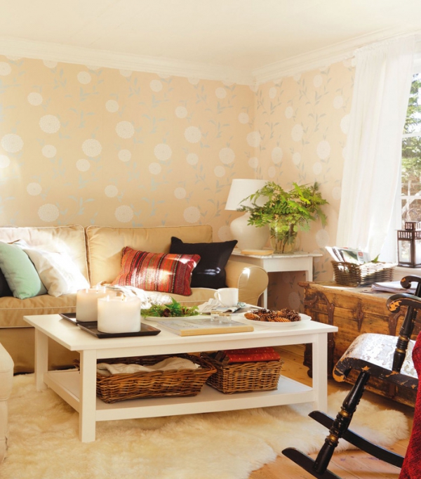 Στο καθιστικό, ένα ουδέτερο χρώμα σχεδίου διακοσμημένο με μικρές πινελιές από χρώμα. Τομοτίβο της ταπετσαρίας προσθέτει ενδιαφέρον στον εξαιρετικό σχεδιασμό του, και ένας βελούδινος καναπέ ακουμπάει στον τοίχο. Τα μαξιλάρια είναι μια θαυμάσια πινελιά, σπάζοντας τα ουδέτερα χρώματα. Ένας λευκό τραπέζι βρίσκεται πάνω σε έναν πολυτελή χαλί, και τα δύο μεγάλα λευκά κεριά προσθέτουν μια δόση ρομαντισμού σε αυτή τη ζεστή ατμόσφαιρα. Δίπλα από τον καναπέ, ένα άλλο λευκό τραπέζι παρέχει μια θέση για τα φυτά και σε μια υπέροχη σε καμπύλες λευκή λάμπα. Μεγάλα παράθυρα επιτρέπουν το φυσικό φως να μπεί μέσα στο δωμάτιο, και λευκές κουρτίνες προστατεύουν της ιδιωτική ζωή των κατοίκων του σπιτιού. Λατρεύουμε το μπαούλο και την κουνιστή καρέκλα, φέρνοντας ένα κομμάτι του ρουστίκ σε αυτή την εξαιρετική σχεδίαση. Δείτε και απολαύστε και τους υπόλοιπους χώρους του σπιτιού στις παρακάτω εικόνες, και πείτε μας αν αυτή είναι η χωριάτικου στύλ διακόσμηση που θα θέλατε και εσείς…