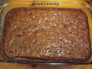 Σιροπιάζουμε το κέικ, αμέσως μόλις το βγάλουμε από το φούρνο, με το καυτό σιρόπι, αφού όμως πρώτε τρυπήσουμε την επιφάνειά του σε πολλά σημεία με ξύλινο σουβλάκι. Αφήνουμε να κρυώσει και να ρουφήξει το σιρόπι.
